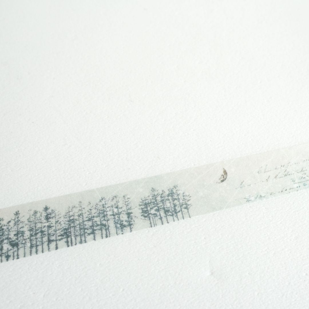 • A beautiful masking tape showing the moon and shooting stars shine in the starry sky over a mysterious forest.